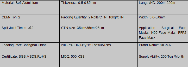 The specification of aluminium nose wire: Soft aluminium, 3mm-5mm width, 0.5-0.85mm thickness, can be packed with or without plastic spool.
